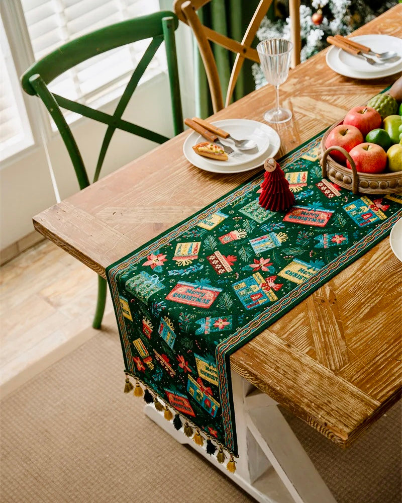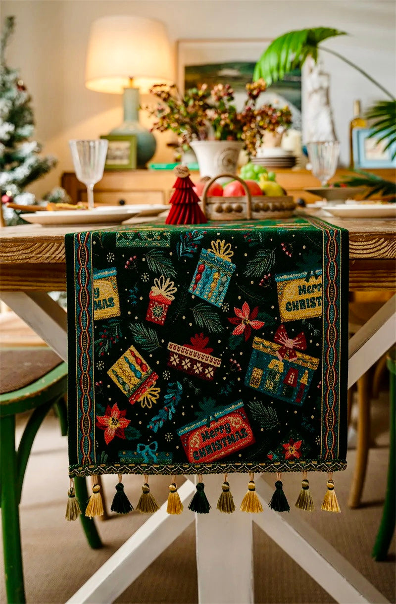 Unwrap the magic of Christmas with this exquisite Merry Christmas Jacquard Table Runner—inspired by the CHERISHED TRADITION of HOLIDAY GIFT-GIVING. Charming gift boxes, in rich, OPULENT hues dance across the fabric, each one telling its own festive story. This table runner with beautiful EMBROIDERY and pretty TASSELS transform any dining table into a festive focal point. Whether you're hosting an intimate dinner or a lively celebration, this piece brings warmth and SOPHISTICATION while honoring the timeless spirit of GENEROSITY that defines the season. Let the spirit of giving shine through every stitch!