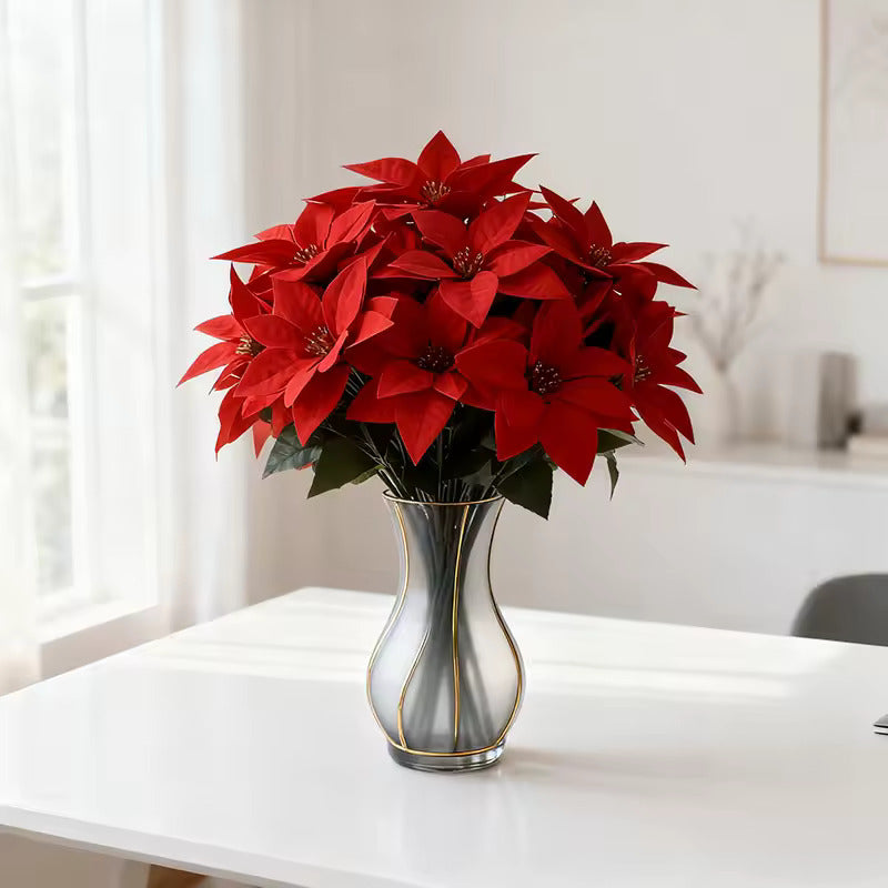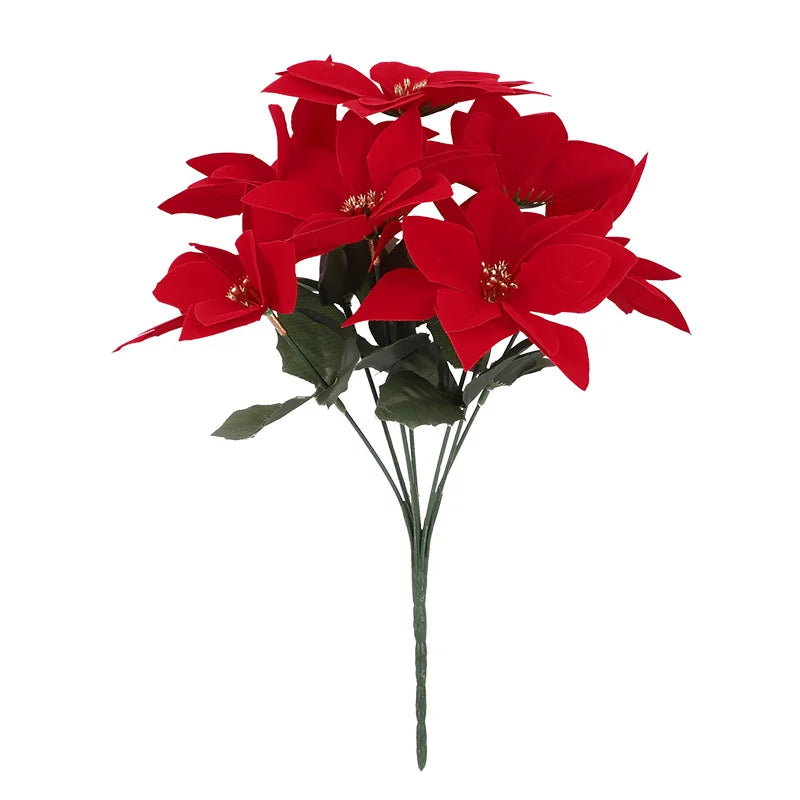 Bring TIMELESS holiday charm with this bundle of 5 classic red Faux Poinsettias. Perfectly complementing traditional festive colors, their VIBRANT floral design captures the spirit of CHRISTMAS. Use them to create stunning CENTERPIECES by mixing with fresh florals, or add warmth to your mantel and window sills. An essential holiday touch that transforms any room into a festive celebration. Durable and MAINTENANCE-FREE, these faux poinsettias offer lasting elegance throughout the season.